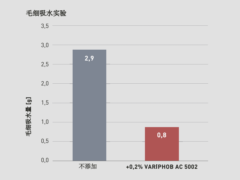 AC 5002 作為粉末狀憎水憎水劑,可在基材固化后表面形成憎水保護(hù),能用于水泥基礦物為原料的干混砂漿體系,阻止材料中毛細(xì)管對水的吸收,大大降低基材的吸水率,提高優(yōu)異的憎水性能;可應(yīng)用在防水砂漿,膩?zhàn)樱羁p劑,裝飾砂漿等場景;