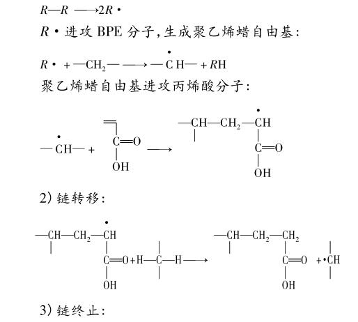 其中,BPE 的接枝改性的反應(yīng)機(jī)理和具體反應(yīng)過 程如下: 1)鏈引發(fā): 在一定溫度下,引發(fā)劑(以 R - R 表示)發(fā)生均裂 產(chǎn)生自由基:
