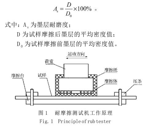 首先,取表面已經(jīng)涂布并完全固化的樣張,剪成 合適的樣條,放在耐摩擦測試機上(耐摩擦測試機 工作原理如圖1所示),摩擦紙為定量80 g/m 2 的膠版 紙,表面清潔,寬度為50 mm,摩擦次數(shù)為40次,行 程不小于60 mm。摩擦之前選取3 點,測量其密度值 并取平均值;然后進行摩擦,完成后,對摩擦損失 較為嚴重的區(qū)域測量其密度值,同樣測量3點并取平 均值;最后,根據(jù)如下公式計算耐摩擦度: